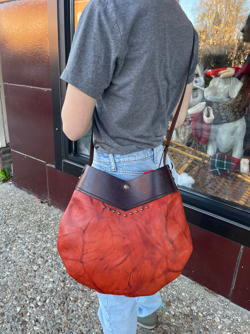 This retro style bag is a great carry all for your everyday needs! The round shape and V cut top make for a very classic and exciting style! This bag measures 8 inches wide and 13 inches deep from the bottom of the V. 21” strap, model is 5’5”.